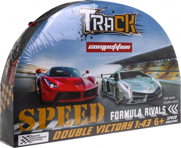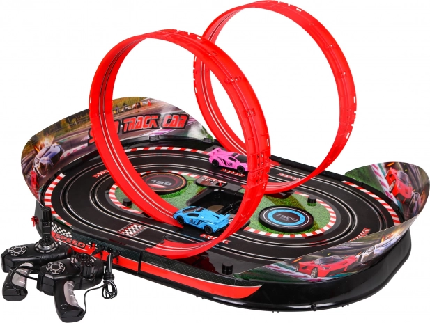 Nyd spændende løb med sættet Speed Track med to loops, to biler og manuel styring. Banen byder på lyseffekter (forlygter på bilerne og bagbelyste “tællere”), lyde af racerkørsel, omgangstæller og nem samling. Ingen batterier – det er nok at dreje håndsvinget på controlleren og køre afsted!