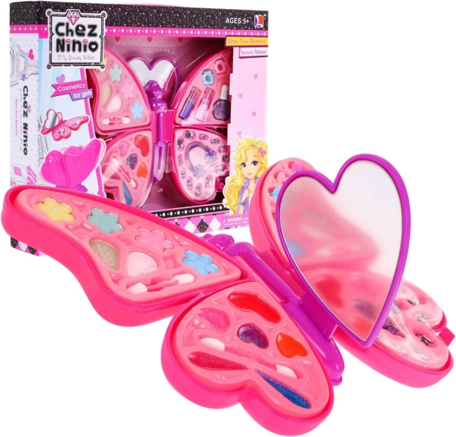 Det praktiske etui i sommerfugleform foldes ud til en overskuelig palette, og det hjerteformede spejl gør makeup nem både hjemme og på farten.
