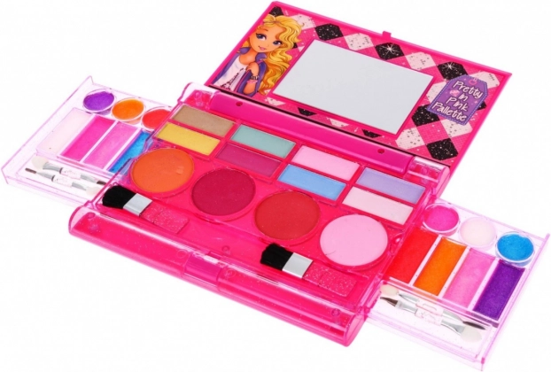 Paletten rummer mange farverige øjenskygger og læbestifter, applikatorer/børster samt et praktisk spejl. Takket være den smarte konstruktion kan den på et øjeblik foldes ud til en overskuelig arbejdsflade og efter brug nemt lukkes igen.