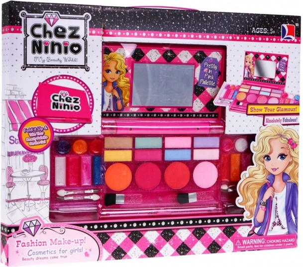 Rosa makeup-palette til børn 5+. Udfoldeligt sæt med spejl, farvede skygger og læbestifter, børster og tilbehør. Sikkert materiale, ideelt til rejser.
