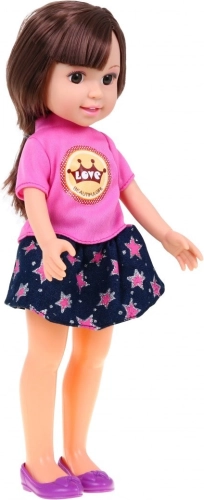 - Komplet sæt: dukke, kjole, T‑shirt, nederdel, sko, spejl og børste