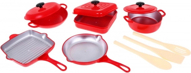 Dette røde køkkensæt er ideelt til leg som hjem, køkken eller restaurant. Børn får realistisk udseende kogegrej med låg, pander og bestik samt et komplet kokkeoutfit. Alt er designet i en populær rød farve og i mål, der passer til små hænder.