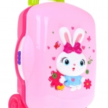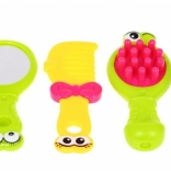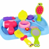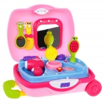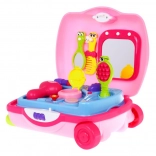 Sættet indeholder et stort og et lille spejl, hårtørrer, kam, børste, “parfume” og “læbestift” (dekorative attrapper). Når legen er slut, kan alt let pakkes tilbage i kufferten på hjul med udtrækkeligt håndtag – en ideel løsning til både værelset og rejser.