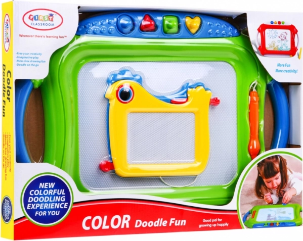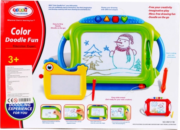 Sættet indeholder en stor magnetisk tavle med flerfarvet tegneeffekt og fire stempler samt en mindre tavle med enfarvet tegning. Begge tavler har fastgjorte penne i snor, så de ikke bliver væk, og praktiske skydere til hurtig sletning af kreationer.