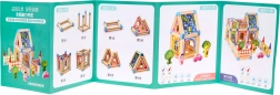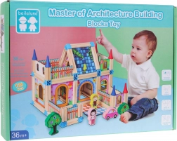 Dette farverige sæt giver børn timevis af kreativ leg. I pakken finder du mindre og større træbjælker, farvede trykte dele (kvadrater, rektangler, trekanter) samt tematiske elementer som træer, figurer og en lille bil. Takket være den medfølgende billedvejledning kan børn nemt begynde at bygge deres første huse og gradvist prøve mere avancerede konstruktioner.