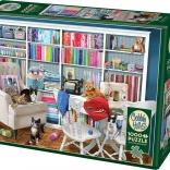 Nyd en premium puslespilsoplevelse med COBBLE HILL – Syværksted. Takket være den særlige stansning, der ikke følger et klassisk gitter, har brikkerne unikke former, hvilket gør samlingen mere attraktiv og intens. Motivet af et hyggeligt syhjørne vil glæde både håndarbejdsentusiaster og samlere af kvalitets-puslespil.