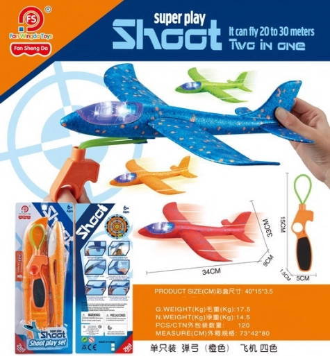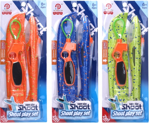 Det sjove affyringsfly med lyseffekter vil glæde både små og store piloter. Længde 34 cm, 3× AG3-batterier medfølger og 4 farvevarianter (blå, grøn, orange, rød) for endnu mere sjov.