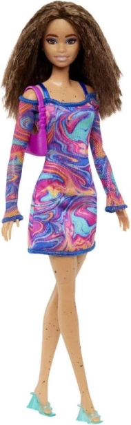 Barbie Fashionistas-dukkerne giver et frisk syn på mode, stil og personlighed. Denne dukke betager med et spil af koralfarvede, lyserøde og blå nuancer på en kjole med marmoreret regnbuemønster, mesh-ærmer og trendy accessories. Ideel til børn, der elsker at kombinere outfits og skabe deres egne historier.
