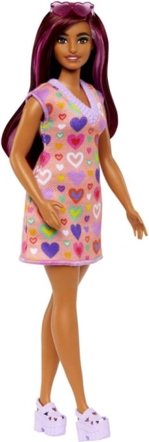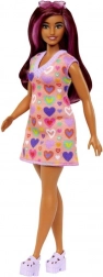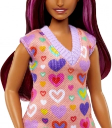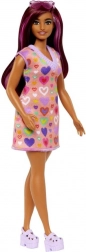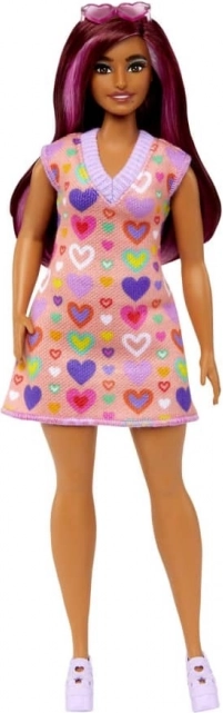 BARBIE Fashionistas-dukken er designet til at afspejle den verden, børn ser i dag – fuld af stil, idéer og individualitet. Hendes smukke hudtone og lange hår med lyserøde striber understreger det unikke udtryk, mens den figursyede kjole med farverigt hjerteprint og ribbet halsudskæring giver outfittet ekstra kant.