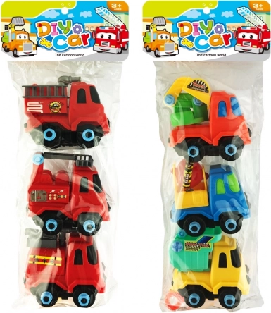 Sæt med skruebiler til børn, som indeholder tre forskellige modeller med en længde på 10 cm. Ideelt til små byggere og brandmænd.