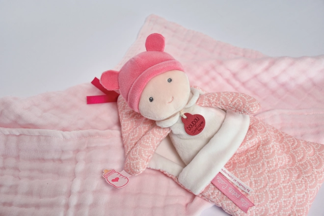 Sød doudou-dukke i lyserødt tæppe til børn fra fødslen, som støtter deres fantasi og følelse af tryghed.