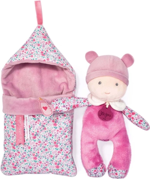 Doudou Jolijou-babyen i en behagelig, aftagelig dynepose er skabt til de første kram. Den bløde, kvalitetsplys er rar at røre ved, dyneposen matcher farvemæssigt pyjamasen med blomstermotiv, og babyen kan til enhver tid tages ud af posen til selvstændig leg. Med følger også en lille flaske til realistisk fodring.