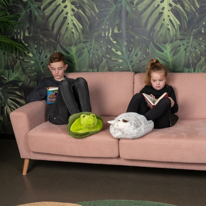 Den store hjemmesutsko i form af en skildpadde er designet til maksimal komfort, når du sidder eller ligger. Takket være den superbløde fyldning og det hyggelige indre holder den fødderne varme uden strøm og uden risiko for forbrændinger. Den er ideel til at se tv, læse, spille spil eller arbejde på laptop.