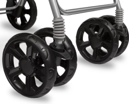Holdbare EVA-hjul med blød affjedring på forakslen dæmper vibrationer. Mulighed for lås til ligeudkørsel hjælper på brosten og ujævnt terræn.