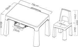 Børnebord med stole FREEON Neo af holdbar plast er en fantastisk tilføjelse til hvert børneværelse, legeværelse eller have. Dens moderne udseende og praktiske funktion gør den til det ideelle valg for små kunstnere og læsere. Bordet er udstyret med to små skuffer på størrelse med 24 x 13 cm, perfekte til opbevaring af småting.