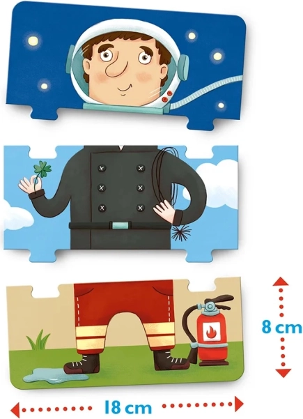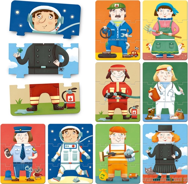 Opdag arbejdsverdener på en legende måde! De tredelte puslespil kan kombineres frit, så I kan skabe sjove figurer – fra astronaut til skorstensfejer. De store, robuste brikker er nemme at holde selv for de mindste og støtter kreativitet og logisk tænkning.