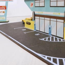 Supermarked med burger-restaurant, parkeringsplads og skiltning skaber en autentisk scene, der drager børn ind i legen og udvikler deres fantasi.