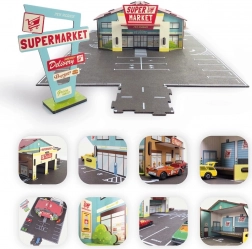 Med dette kreative byggesæt bygger du et supermarked med burger-restaurant, parkeringsplads, til- og frakørsler samt tilsluttede vejstykker. Delene samles nemt, holder sikkert under leg og giver børn timevis af fantasifuld kørsel med legebiler. Komponenter i karton og træ fra ansvarligt indkøbte materialer sikrer holdbarhed og miljøhensyn.