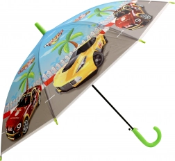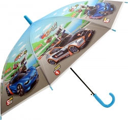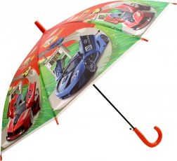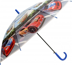 Vælg mellem flere varianter af farver og design med biler. Paraplyen har sikre spidser på stængerne og et ergonomisk håndtag for et sikkert greb.