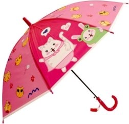 Vælg mellem flere motiver – søde katte, glade frøer, farverige dinosaurer eller polardyr. Hver variant har et farvekoordineret, krumt håndtag for en sikker og behagelig greb. Den robuste skærmkonstruktion beskytter pålideligt mod regn og forvandler gråt vejr til sjov.