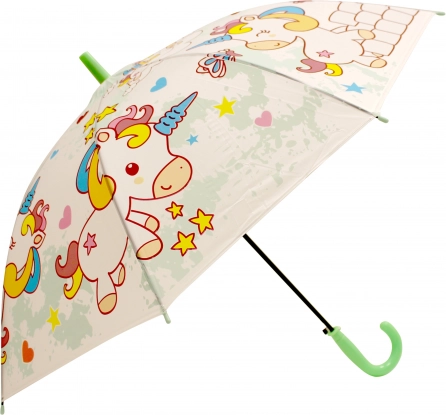 En legende og let paraply med enhjørningemotiv, som er en fantastisk ledsager på regnfulde dage. Den kompakte størrelse på 50 cm er ideel til børn, håndtaget ligger godt i hånden, og konstruktionen er designet til nem åbning.