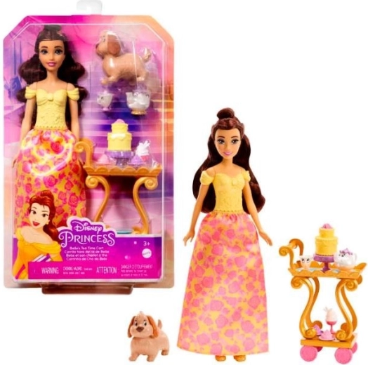 Disney-prinsessen Belle og hendes venner inviterer dig til en hyggelig eftermiddagste på slottet! Dukken Belle ser fantastisk ud i sit yndlingsgule outfit, og sættet indeholder også en te-vogn, vennefigurer og mad. Fans kan genskabe deres yndlingsøjeblikke fra filmen eller finde på deres egne uforglemmelige historier. Dukken kan ikke stå uden støtte. Farver og dekorationer kan variere.