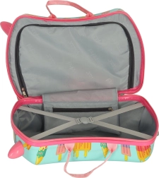 Den særlige konstruktion gør det muligt for barnet at sidde på kufferten eller køre en kort tur. Integrerede fodstøtter og håndgreb sikrer komfort og et mere sikkert greb.
