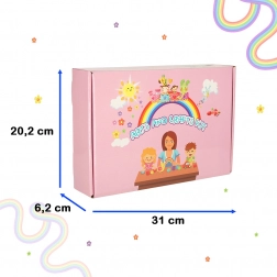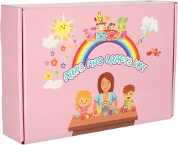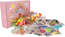 Pakkens indhold omfatter blandt andet: bløde og glitrende piberensere, træspatler, farvede papirlapper, sæt med klistermærker, bevægelige og farvede øjne, pomponer, fjer, perler inklusive bogstaver, plastiksnor til trådning samt sikre børnesakse. Det hele er opbevaret i en fin lyserød æske, som også er ideel som gave.