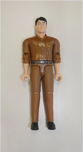 Bevægelig figur af en UPS‑chauffør, velegnet som tilbehør til Bruder-modeller. Mand i typisk brun uniform. Fremstillet i Tyskland af materialer af høj kvalitet. Vigtigste egenskaber: bevægelig figur, fremstillet i Tyskland