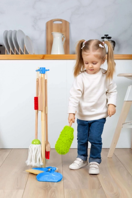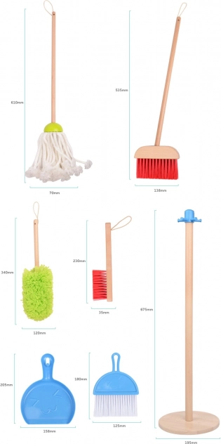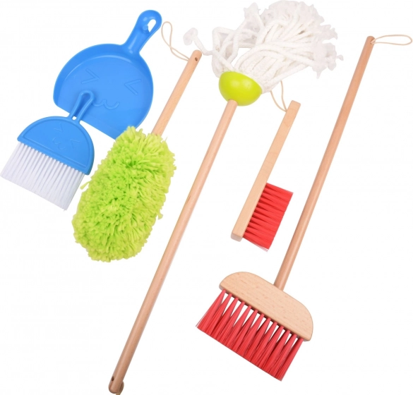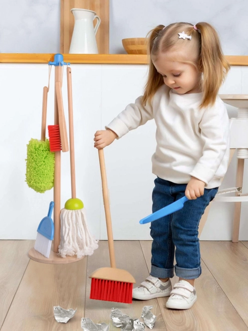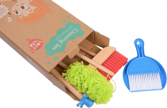 Denne pakke indeholder farverige legeværktøjer, herunder kost, moppe og støvefjerner, hvilket øger både den visuelle og legemæssige oplevelse for børnene.