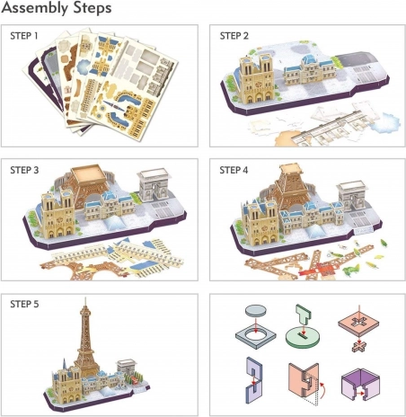 3D-puslespil City Line Paris er spændende underholdning for både børn og voksne. Pakken indeholder 114 puslespilsbrikker, som er fremstillet af et særligt skummateriale. Brikkerne er nummererede, udstanset og placeret på ark. Tryk dem let ud af arket uden kraft, og saml dem efter den medfølgende vejledning, uden brug af lim eller specialværktøj.