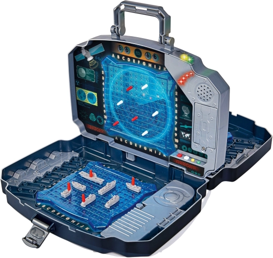 Transportabelt elektronisk spil Søslag i en robust kuffert med to blå spillegitre, opbevaringsrum og effekter af lys og lyd. Understøtter 2 spillere, nem registrering af træffere med røde og hvide pinde og intuitiv betjening for børn fra 5 år. Ideel derhjemme og på farten.