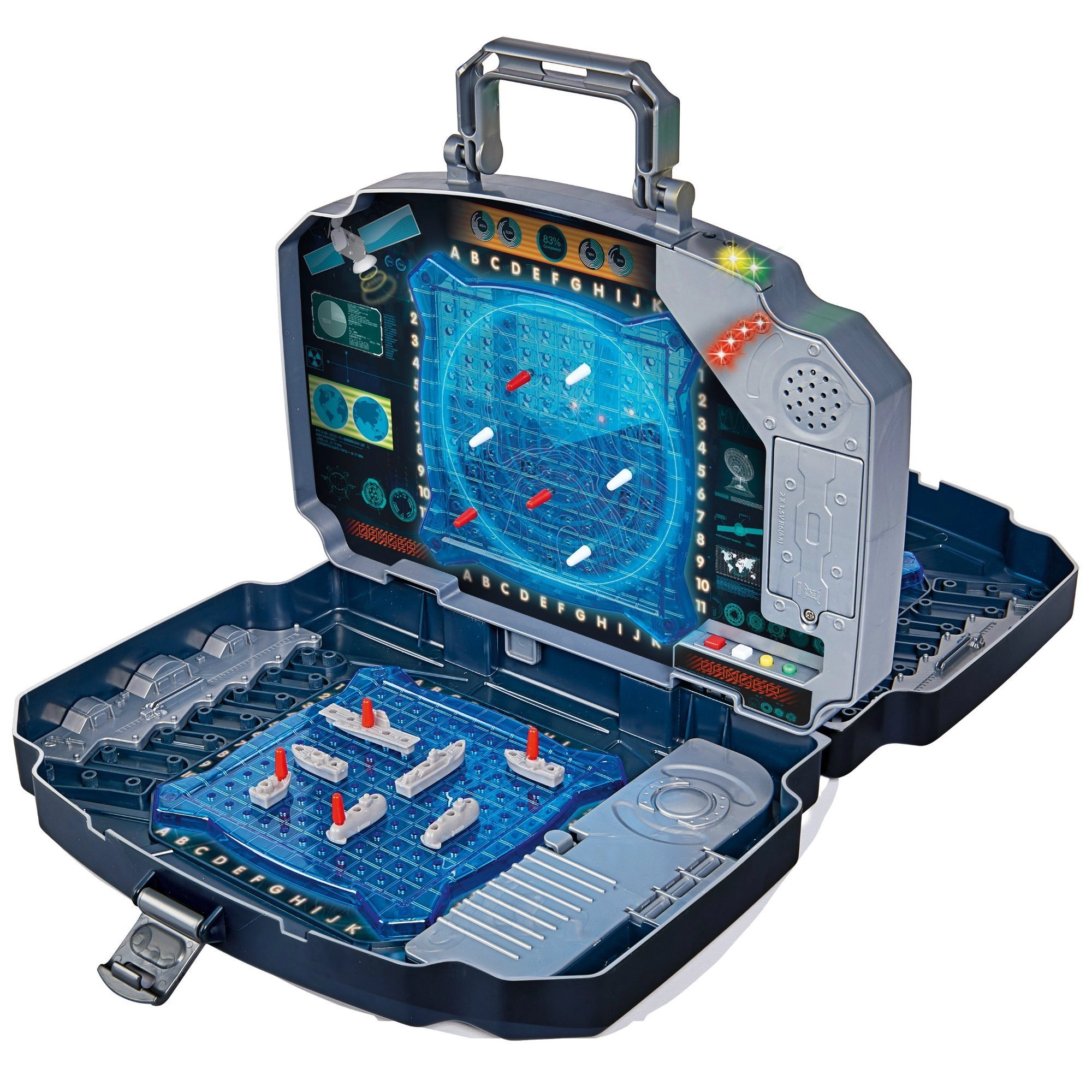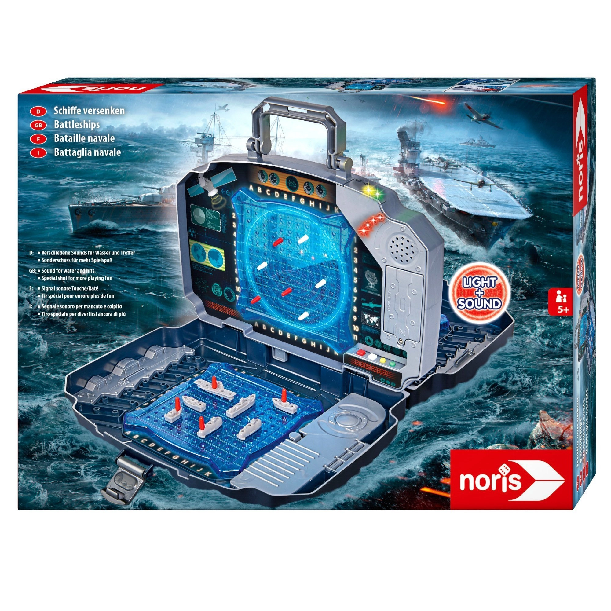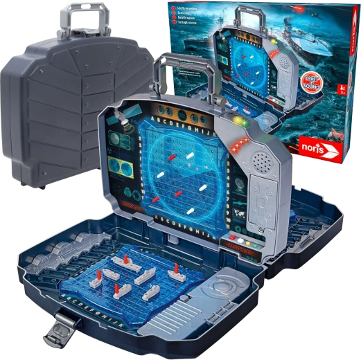 Nyd det klassiske spil Søslag i en moderne udgave. Den solide grafitgrå kuffert rummer to blå spillegitre til placering af skibe og et midterpanel til markering af skud mod modstanderen. Integrerede lys- og lydeffekter angiver tydeligt træffer og forbi – spillet bliver dermed overskueligt, spændende og sjovt for hele familien.