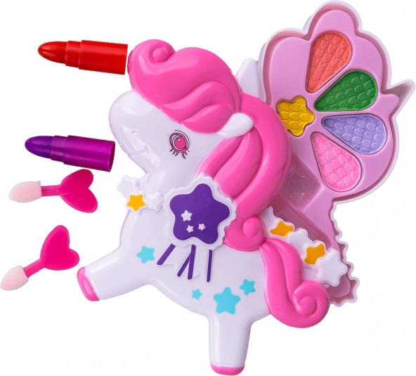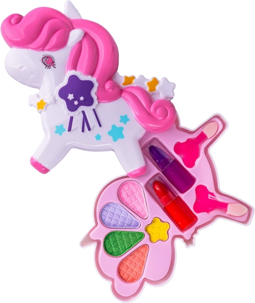 Designet med en hvid enhjørning og pink manke stimulerer fantasien og gør makeup til en sjov aktivitet.