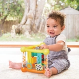 Aktivt legetøjscenter i trekantet form med mange elementer: forskellige former, perler, knapper. Velegnet til leg både inde og ude. Den trekantede form gør det nemt at tage legetøjet med og transportere det. Hver side byder på en ny aktivitet.