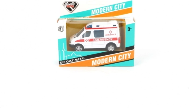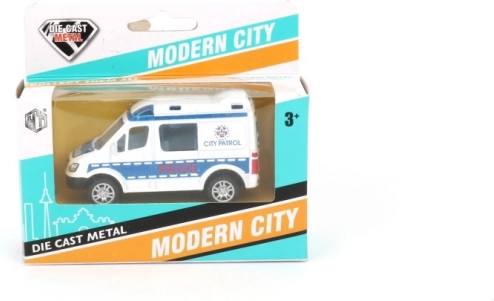 Metalmodel af politibil og ambulance med pull-back motor og åbne døre. 4 design, fra 3 år. Holdbar legebil til actionfyldt leg og samlere.