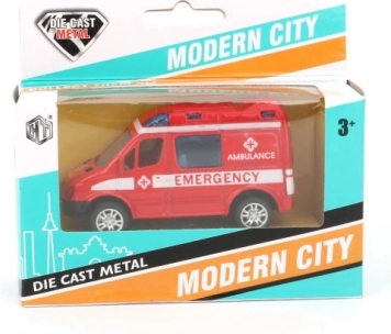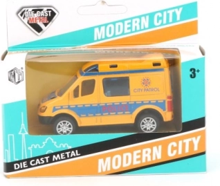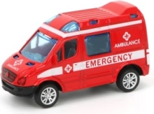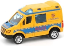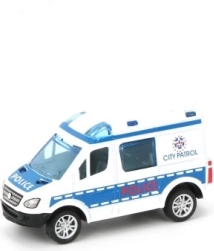 Stilfuld lille bil til små redningsfolk og politibetjente: metalmodel med åbne døre og pull-back motor. Fås i 4 design (politi/ambulance), perfekt til børn fra 3 år.