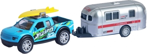 Opdag et stilfuldt sæt, hvor en robust bil trækker en detaljeret anhænger. Metaludførelsen sikrer holdbarhed og lang levetid, de åbne døre indbyder til at udforske interiøret, og den mekaniske pull back sørger for dynamisk kørsel uden batterier.