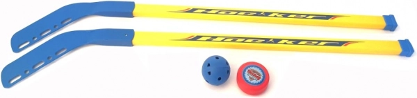 Sættet indeholder en plastik-hockeystav, en plastikbold og en puck.