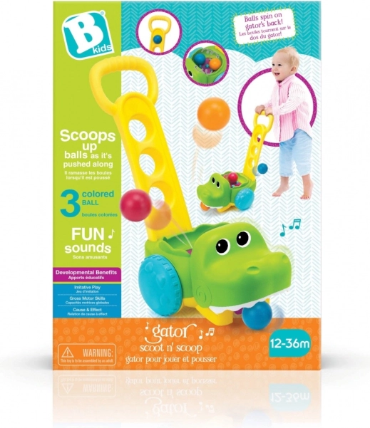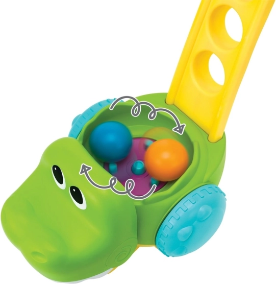Mød den søde krokodille, der bliver til en lille “støvsuger” til bolde, når den skubbes. Børn griber det behagelige håndtag, sætter legetøjet i gang og ser, hvordan krokodillen samler farvede kugler op i munden og derefter skyder dem glædesfyldt ud igen. Interaktive lyde motiverer til flere skridt og forlænger legeoplevelsen.