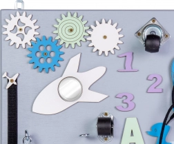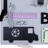 - tandhjul, lynlås, klokke, stik/låse, sko med snøring, trætal og -bogstaver, drejehjul, velcro, bane med lille bil, tavle til kridt, krog, spejl, ur med visere, formesorterer (3 former), lineal, kontakt