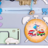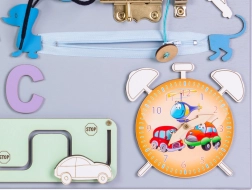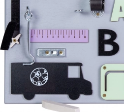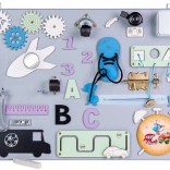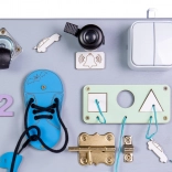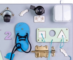 Opdag et sjovt og lærerigt legetøj til de mindste – en træ-manipulationsplade, der udvikler finmotorik og logisk tænkning. Takket være mange elementer fra hverdagen kan børn sikkert prøve at knappe, dreje, skubbe og snøre, træne hånd–øje-koordination og koncentration. Pladen kan stilles, lægges eller hænges på væggen.
