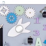 Pladen kan placeres på bordet, lægges på gulvet eller hænges på væggen takket være integrerede ophæng. Medfølger gør også selvklæbende filt, der beskytter gulvet mod ridser. Leg, der udvikler: finmotorik, tålmodighed, fantasi og evnen til at tænke i sammenhænge.