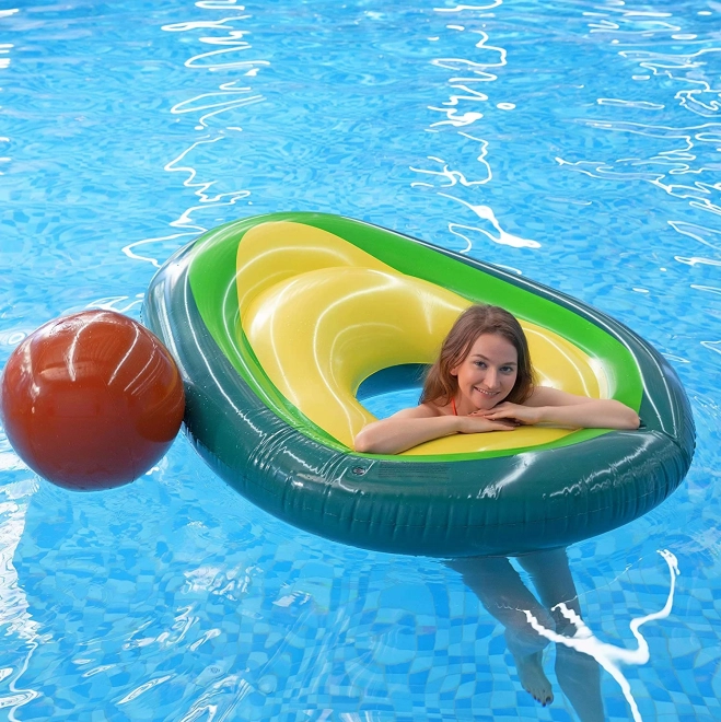 Den originale luftmadras formet som en moden avocado lyser op ved enhver pool og på stranden. Den aftagelige “sten” fungerer som en selvstændig bold til vandet og strandspil eller som en pude/rygstøtte, når du daser på vandet. Den åbne midte gør madrassen til en stabil ring til afslapning og svømmeøvelser.