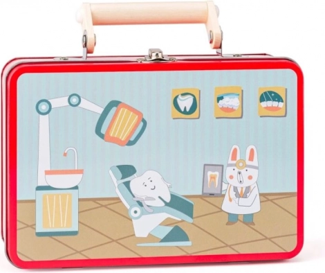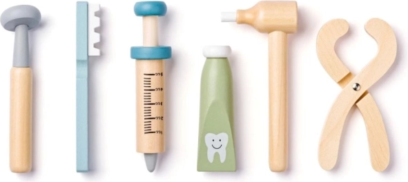 Dette stilfulde tandlægesæt til børn indeholder alt, hvad der behøves til den første leg med tandklinik. Træredskaberne ligger godt i hånden, er sikre og holdbare, og metalæsken holder det hele pænt organiseret hjemme og på farten. Perfekt til at styrke sociale færdigheder og hjælpe med at overvinde tandlægeskræk.