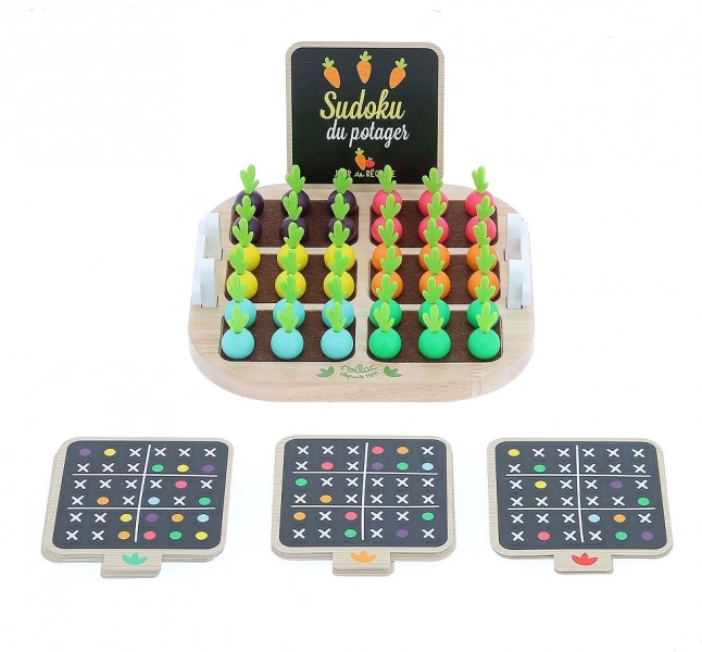 Her er en enestående mulighed for at underholde børn og samtidig udvikle deres kognitive evner. Spillet Grøntsags-Sudoku er lavet af kvalitets-træ, hvilket sikrer stabilitet og holdbarhed. Med farverige træstykker formet som grøntsager forsøger børn at udfylde gitteret efter de medfølgende kort, uden at farver gentages i samme række, kolonne eller blok.