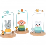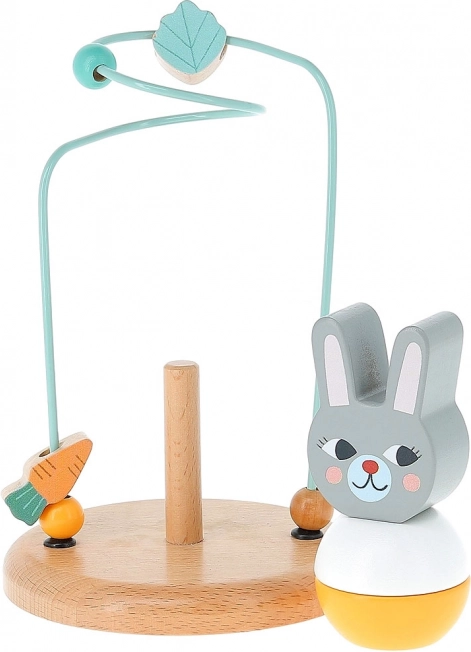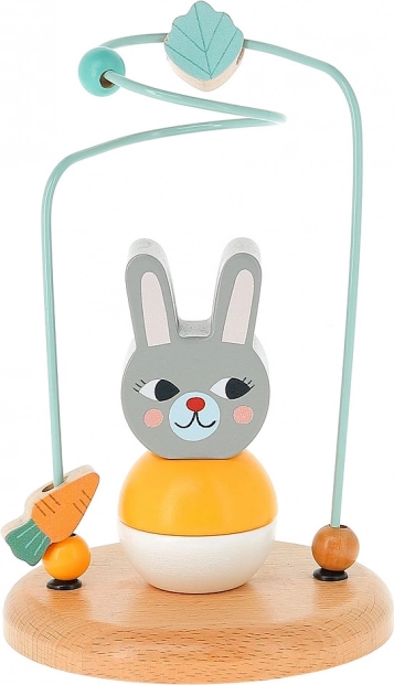Denne trælabyrint med metalbane og en kaninfigur tilbyder en sjov aktivitet, hvor børn flytter perler og former (gulerod, blad) langs en bølget rute. Legetøjet understøtter udvikling af finmotorik, koncentration og tålmodighed og er samtidig sikkert og stabilt takket være den solide træbase.
