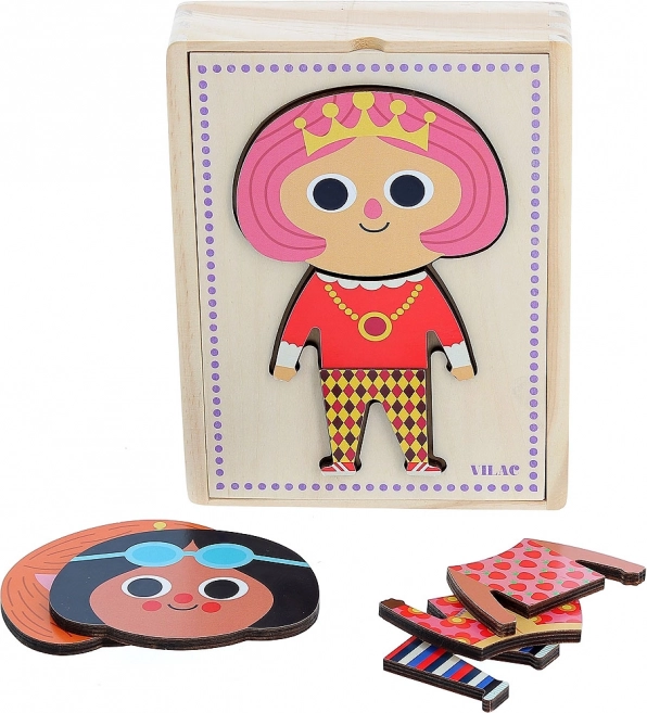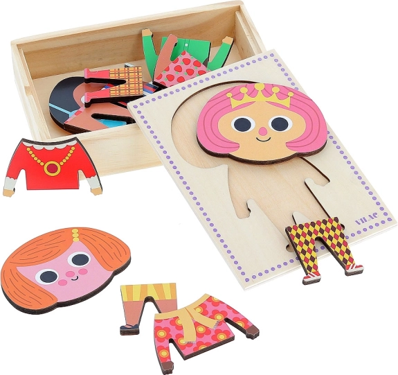 Dette træ påklædningspuslespil giver børn mulighed for at klæde figuren Jade stilfuldt på. Med 6 forskellige sæt kan børn kombinere outfits og udvikle deres fantasi.