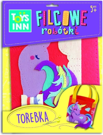 Dette sjove sæt er ideelt til begyndende små skabere. De forberedte filtdele sys let sammen med en plastnål og bomuldstråde, så projektet er sikkert og velegnet til børn. Resultatet er en holdbar og sød lilla håndtaske med enhjørning i målene 26 × 17 × 9 cm.