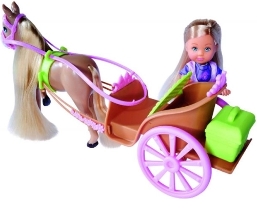 Oplev et magisk sæt med dukken Evi Love og hendes karet trukket af en hest – ideelt til fantasileg, udvikling af kreativitet og omsorg. Sættet inkluderer en karet med skjult opbevaringsrum, en hest med lang man og hale til at børste samt en stilfuldt klædt dukke. En skøn gaveæske, der vil glæde enhver lille hesteelsker.